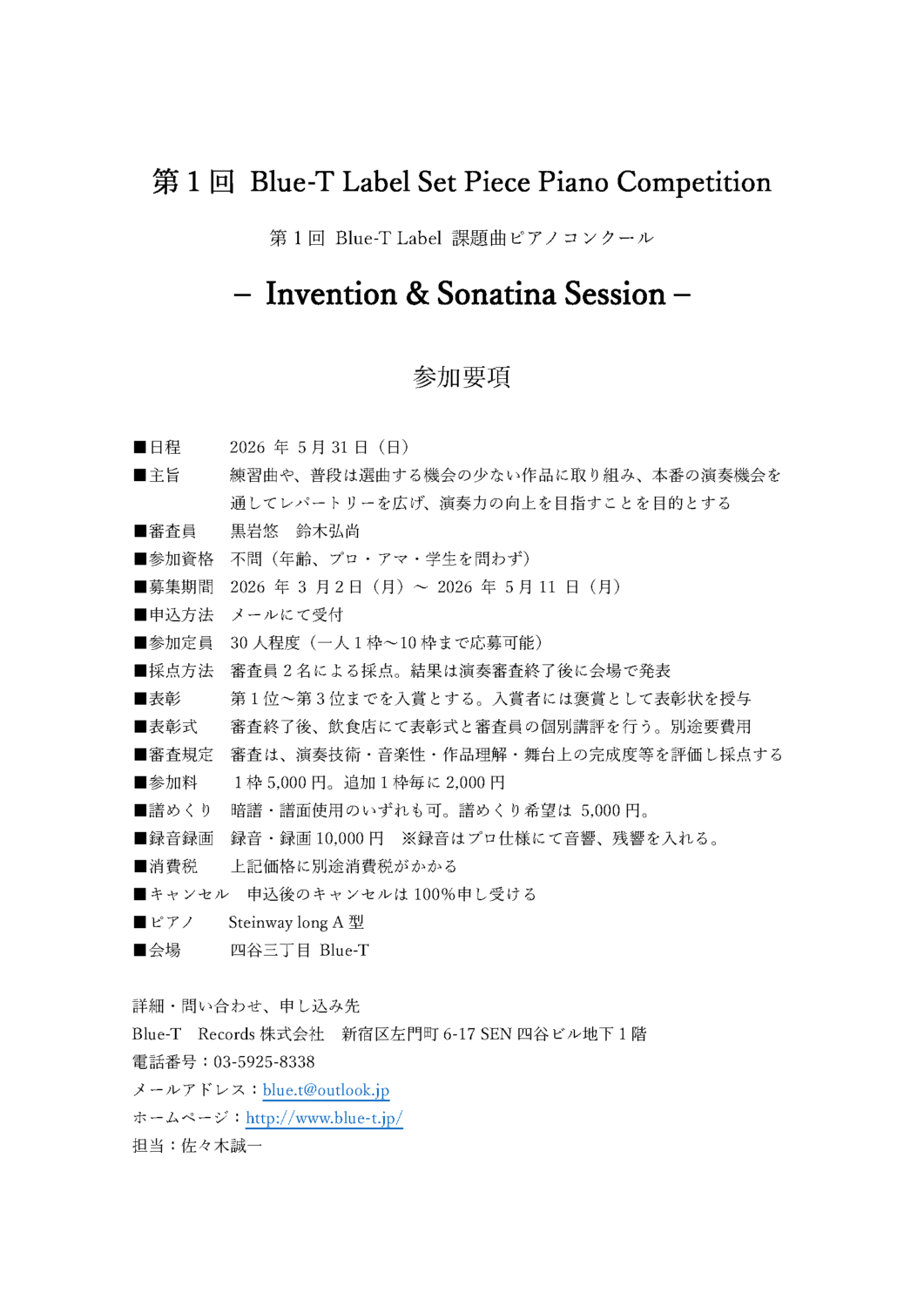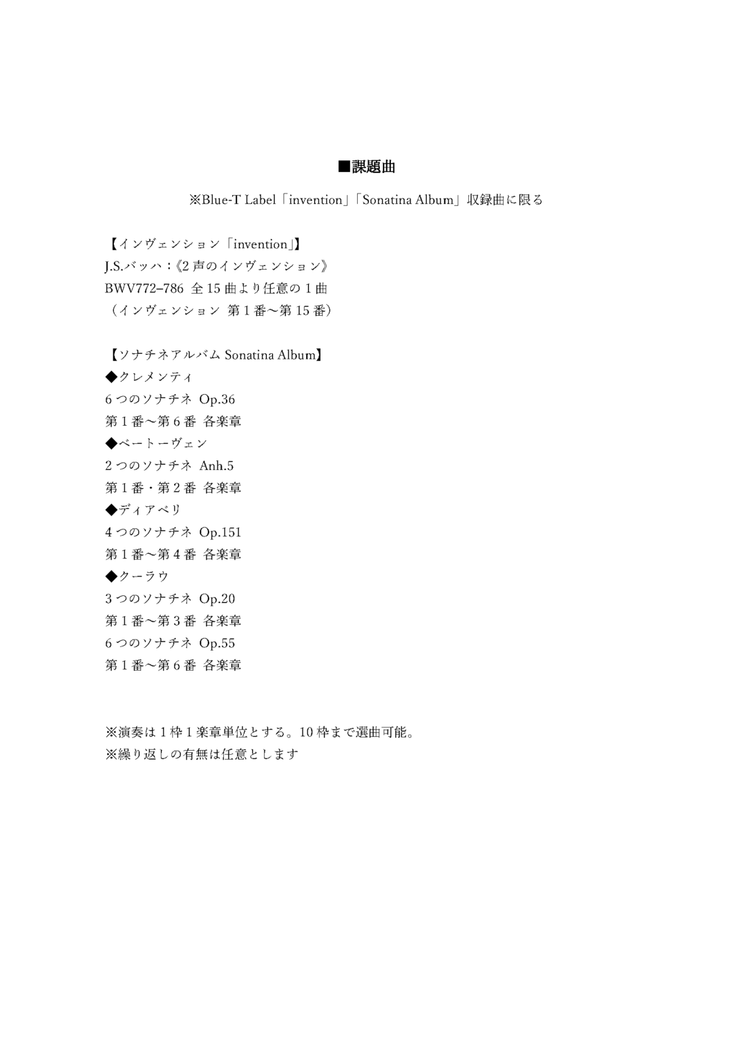 Blue-T Labelでは、練習曲などの学習過程にある作品に焦点を当てた新たなコンクールを開催いたします。本コンクールでは、普段のレッスンの中では取り組む機会の少ない作品や、自ら選曲する機会の少ない楽曲にも挑戦し、本番の演奏機会を通して新たなレパートリーを広げることを目的としています。